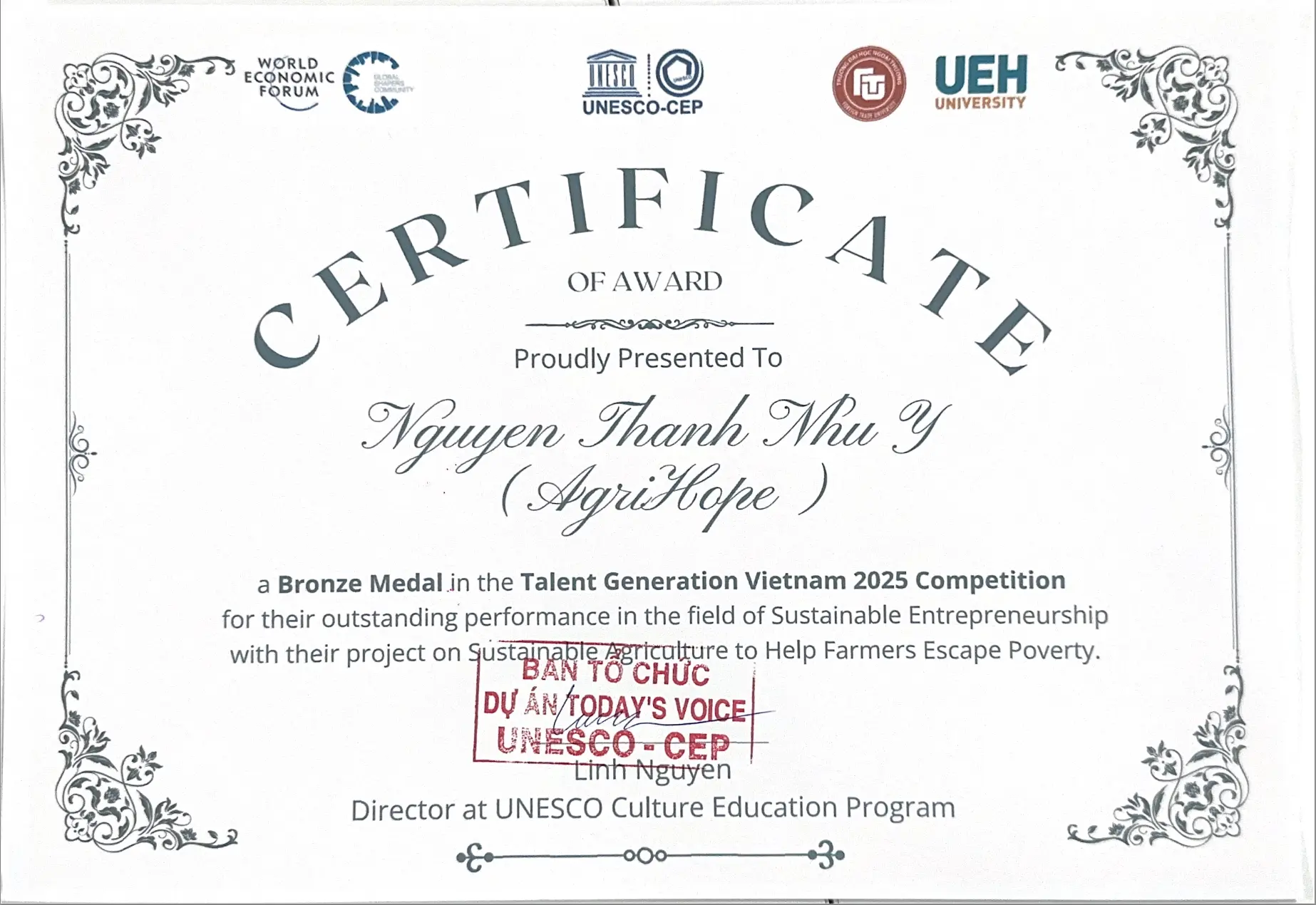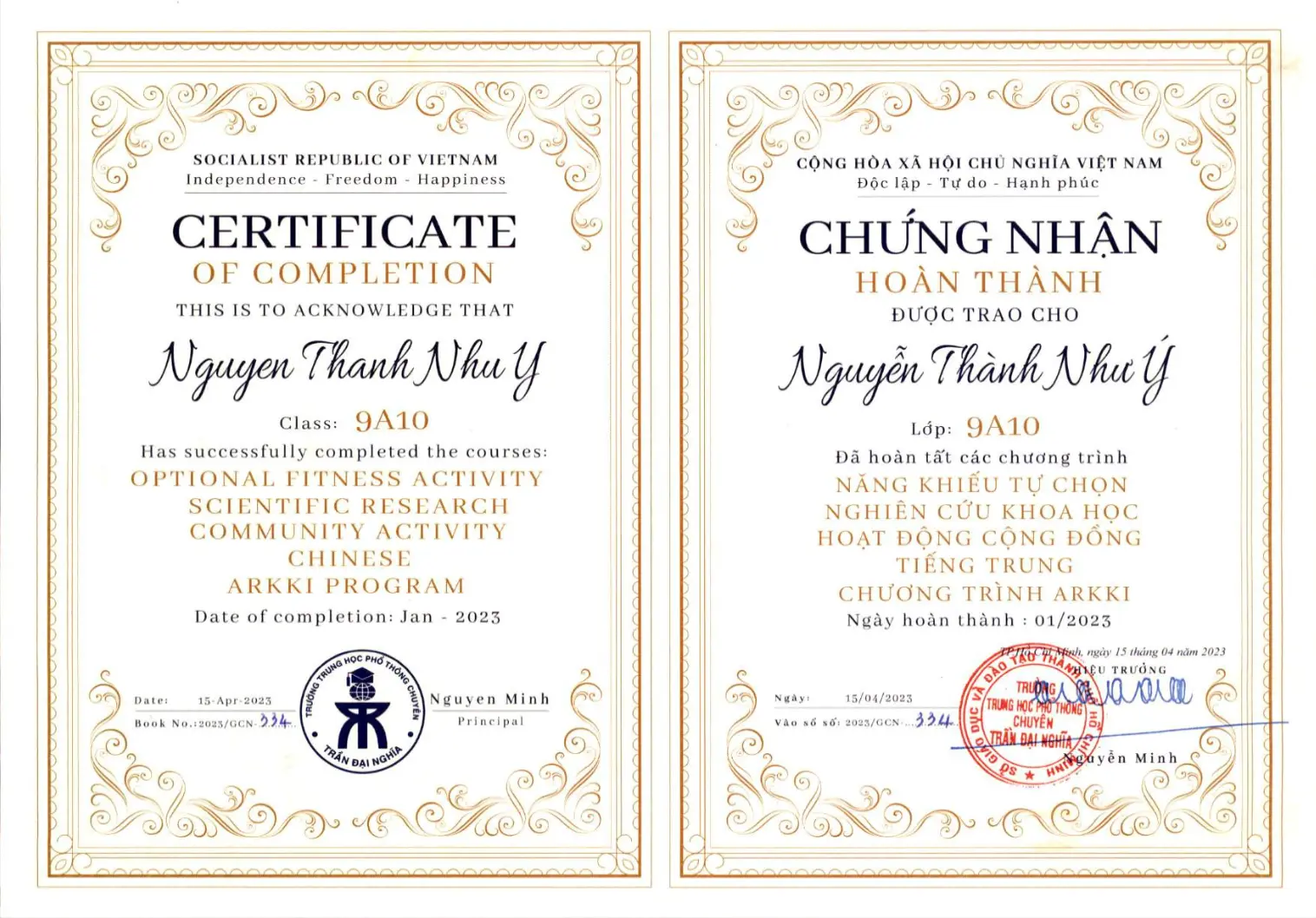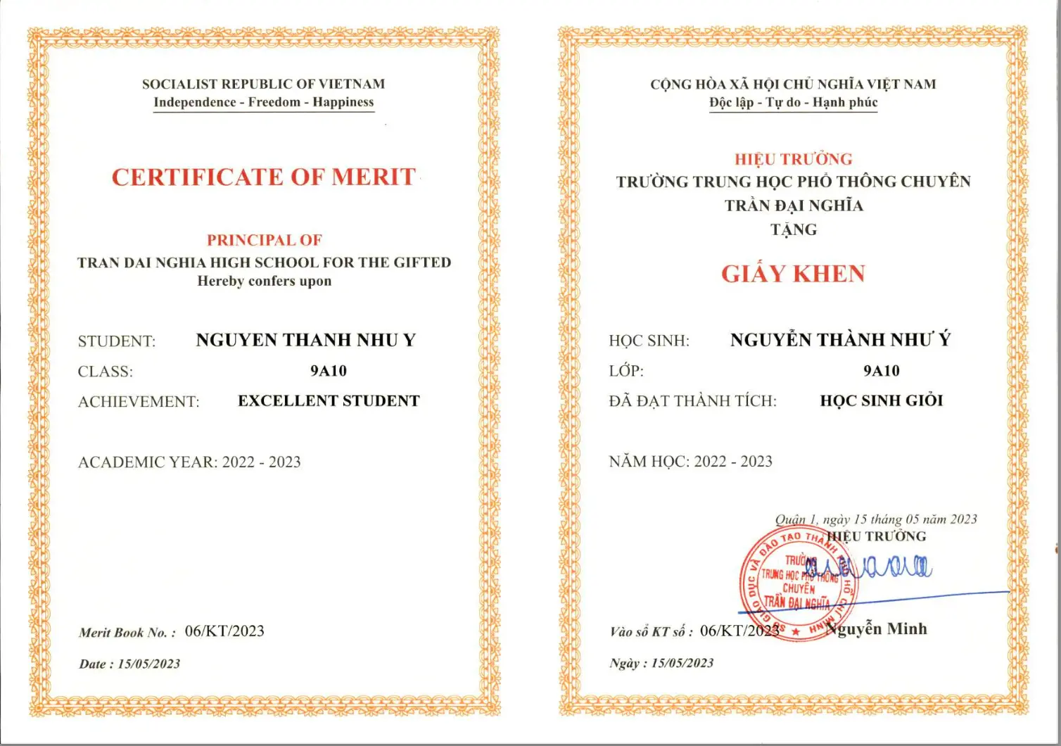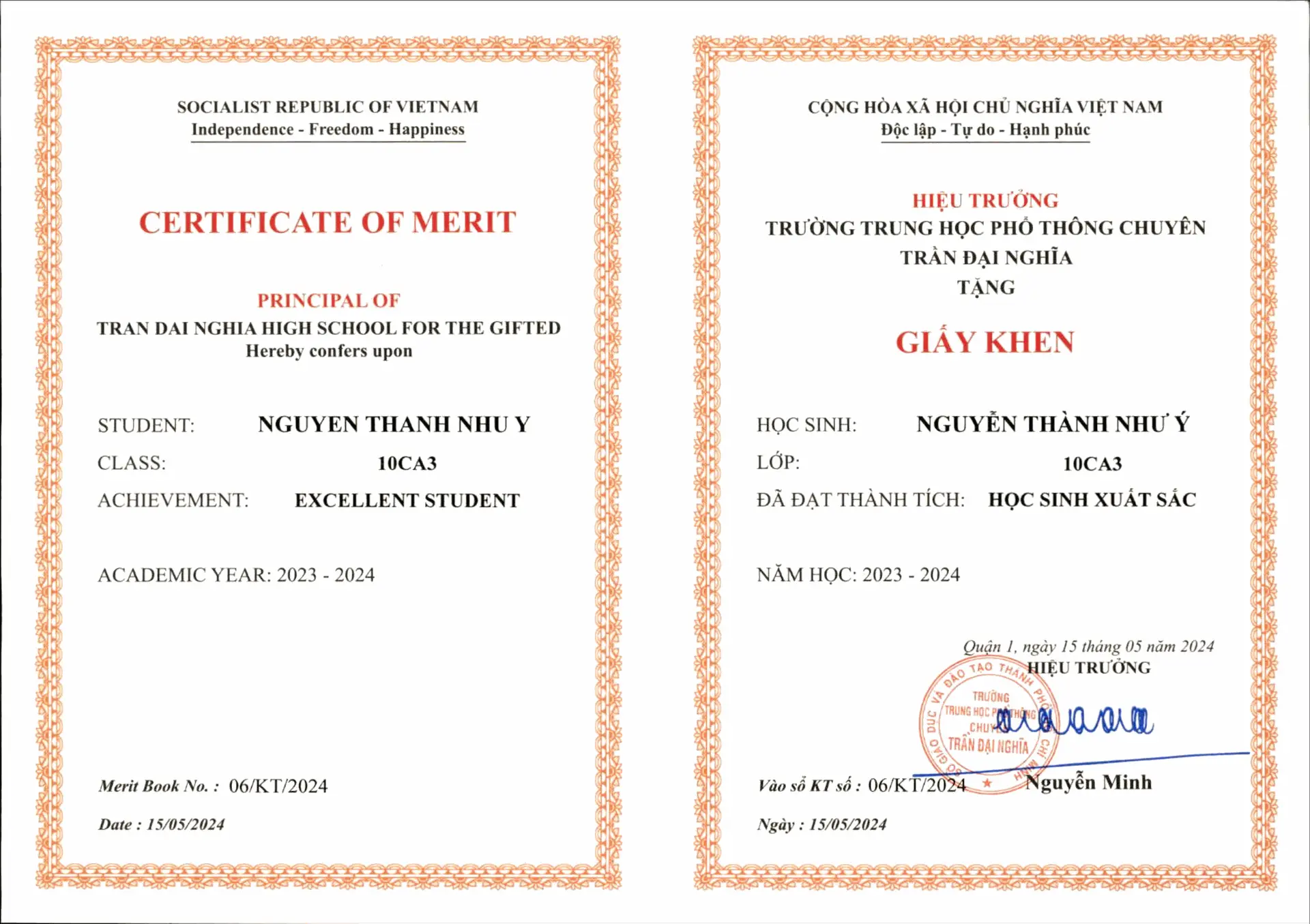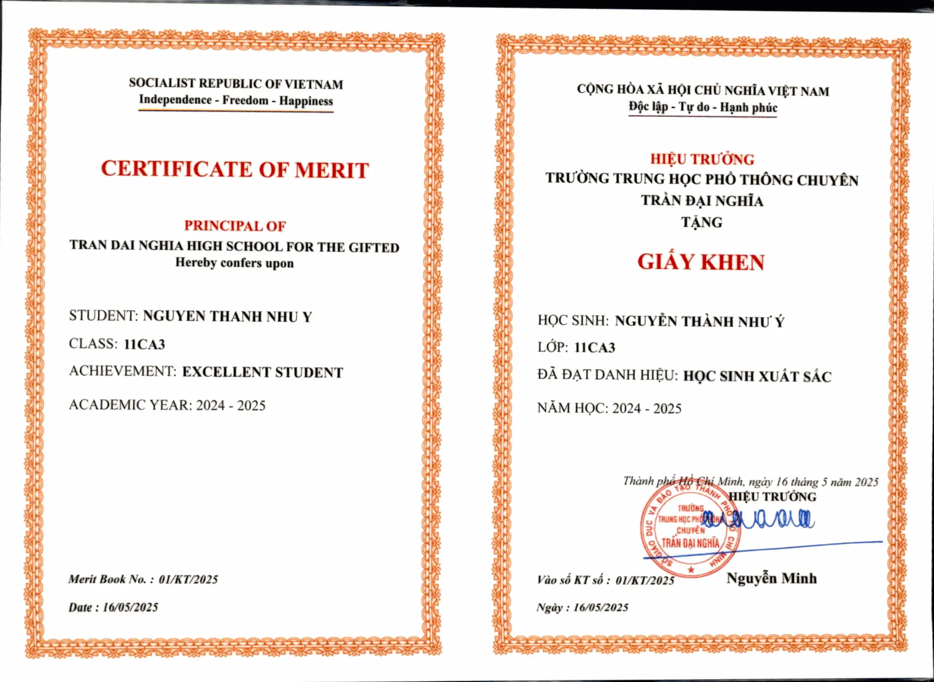 Merit Scholarship from Tran Dai Nghia Highschool for the Gifted, Vietnam (2024, 2025)