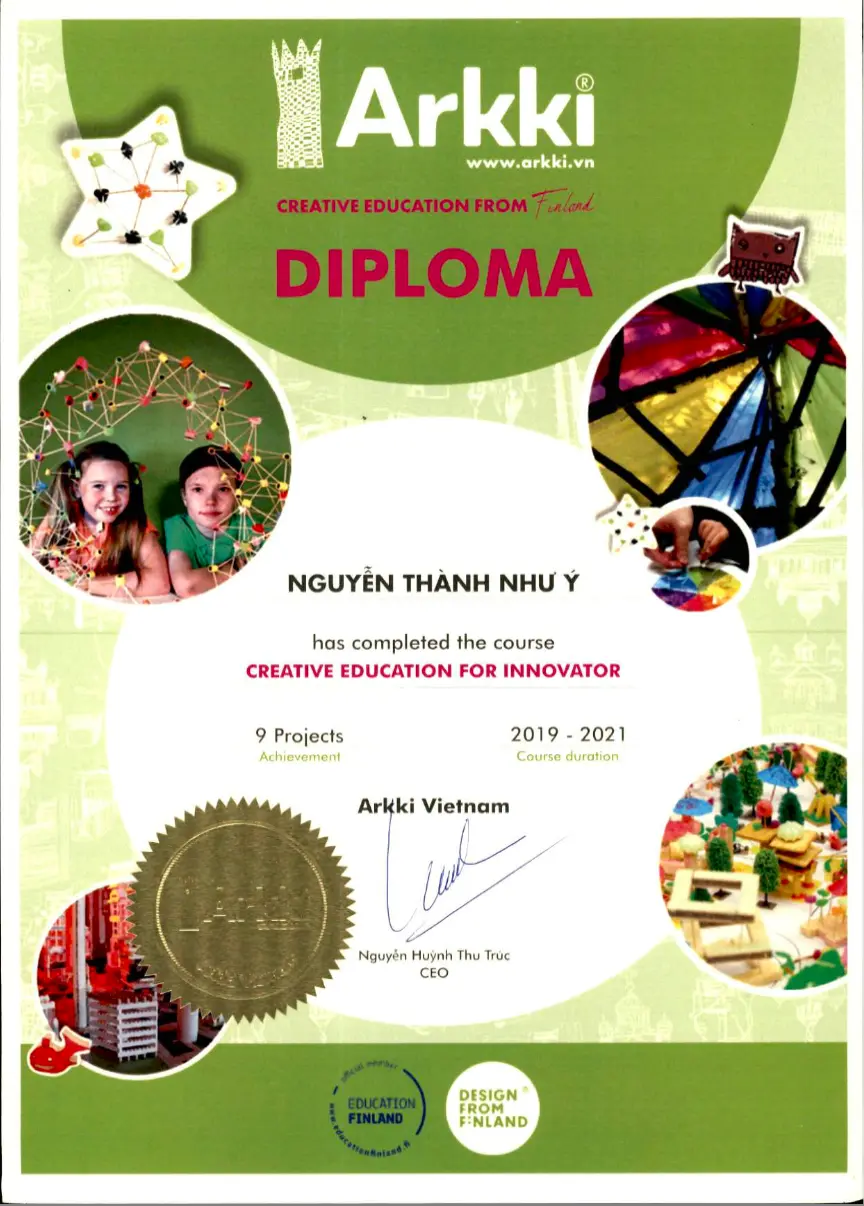 Arkki offers creative education, leveraging architecture and design as holistic real-world phenomena to seamlessly integrate Science, Technology, Engineering, the Arts, and Mathematics (STEAM) subjects + Humanities and Social Sciences. Collaborating with Tran Dai Nghia High School for the Gifted, Arkki brings innovative lessons to students and encourages them to think outside the box. From 2019 to 2021, I was certified as having completed the “Creative Education For Innovator” course, achieving nine projects, and was praised by Arkki teachers as one of the most outstanding students.